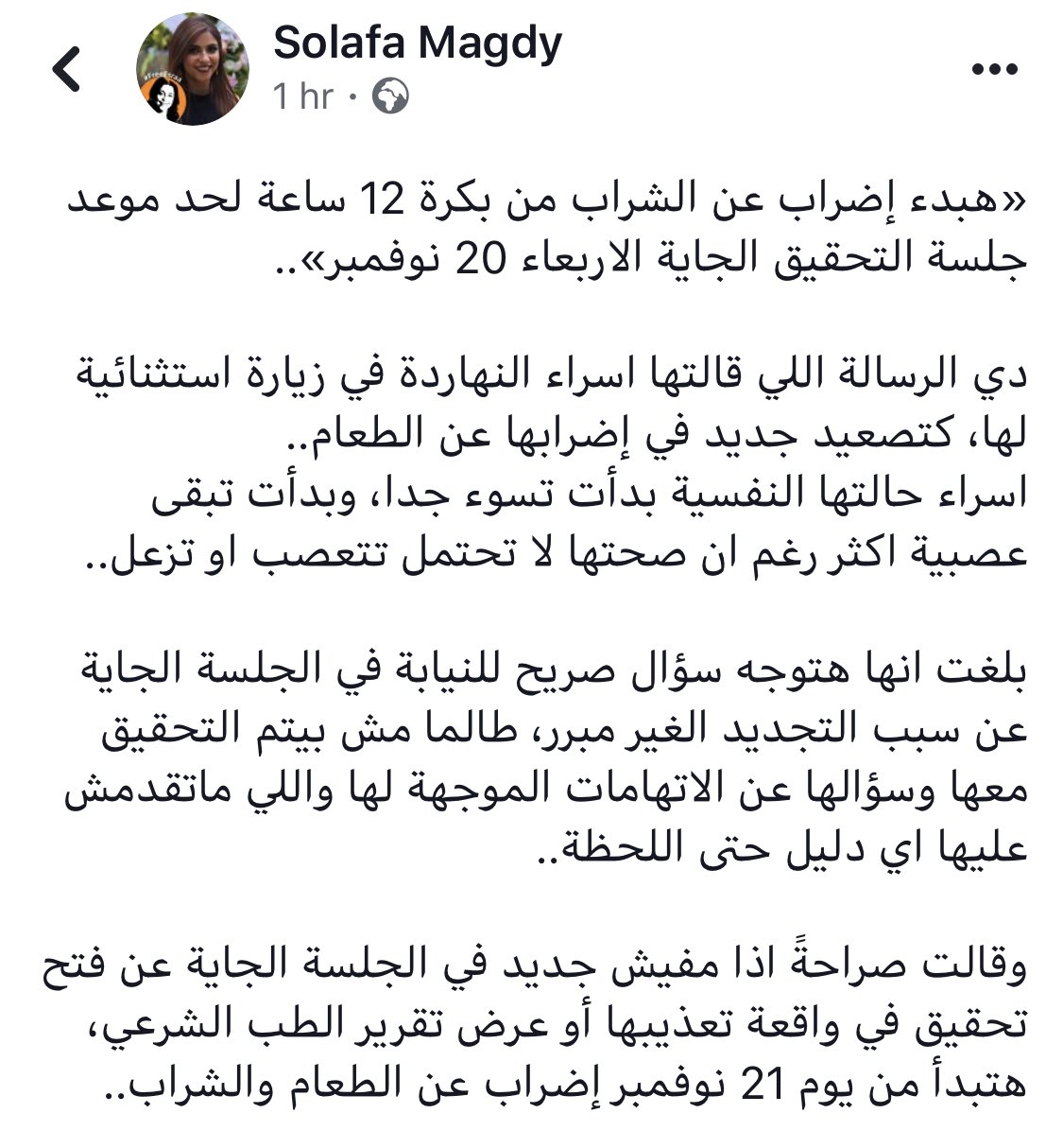 Solafa Sallam On Twitter My Friend Esraa Told Me Today Will Start A Thirst Strike From Tomorrow For 12 Hours Until The Next Hearing In Front Of The State Security Prosecution On